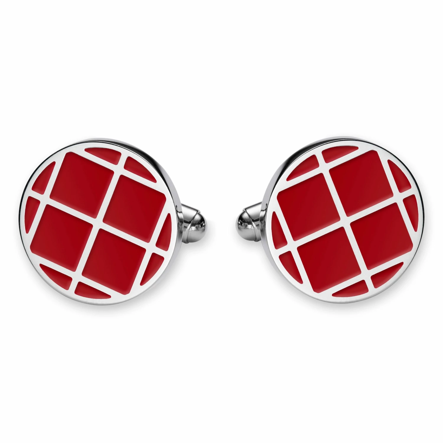 A must-have staple, this pair of red and silver cufflinks features a geometric design with bullet backing. Stylishly handsome and easy to wear with your favorite french cuffs and tie.