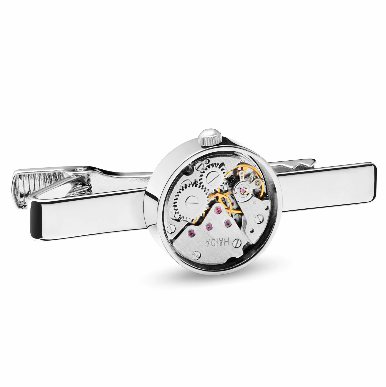 This tie clip houses a working mechanical movement and is made from strong copper, polished to shine. Wind the crown to start it moving.