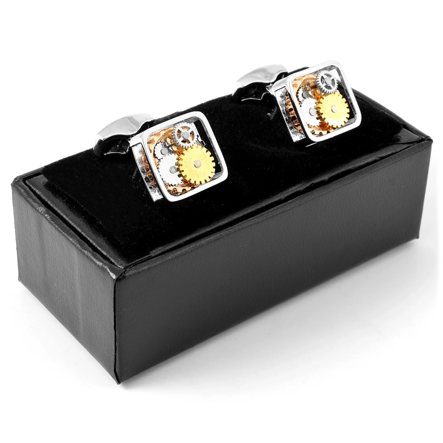 Silver-toned frame contains gears like those inside a mechanical watch. Two of these gears move around freely. Sides and front are open. Made of high-quality polished stainless steel. Comes in an elegant box, perfect for gift giving!