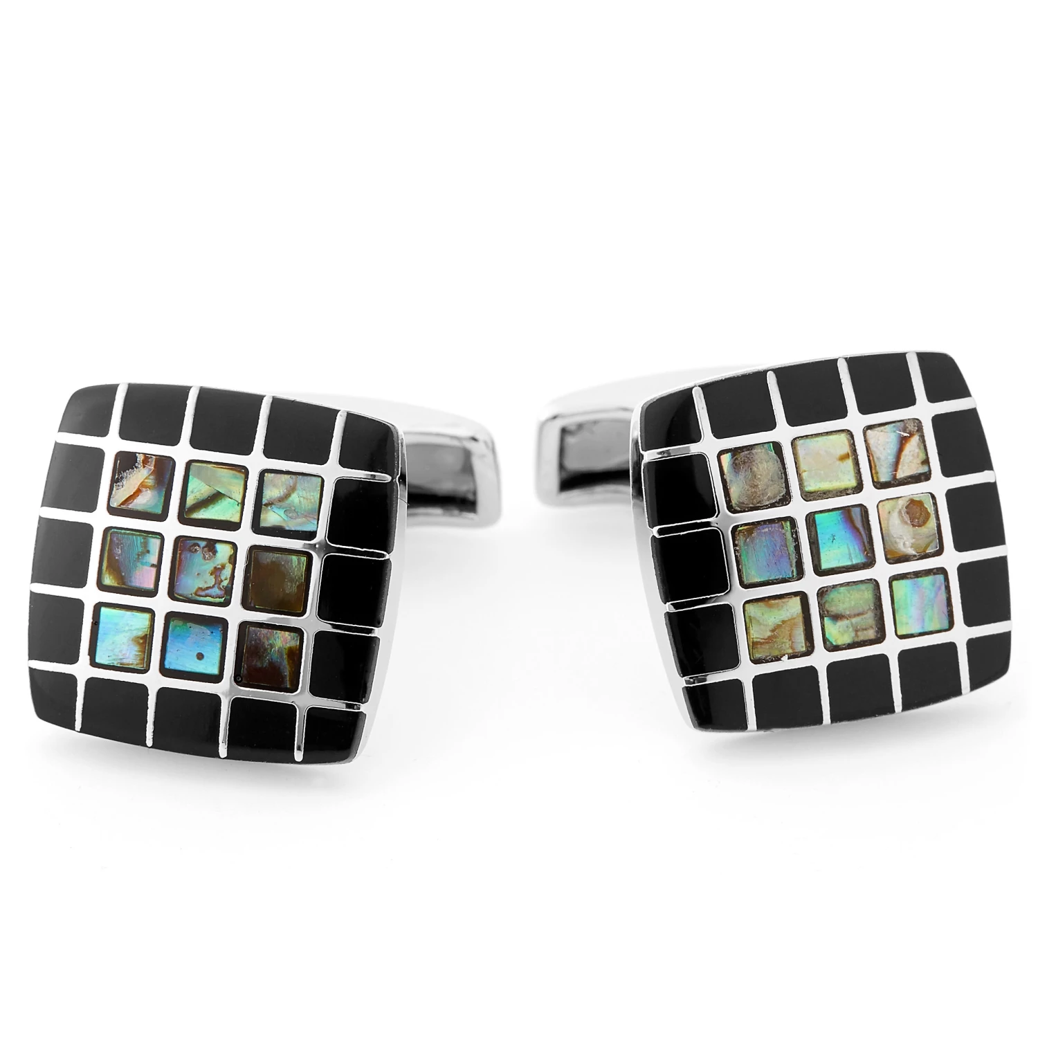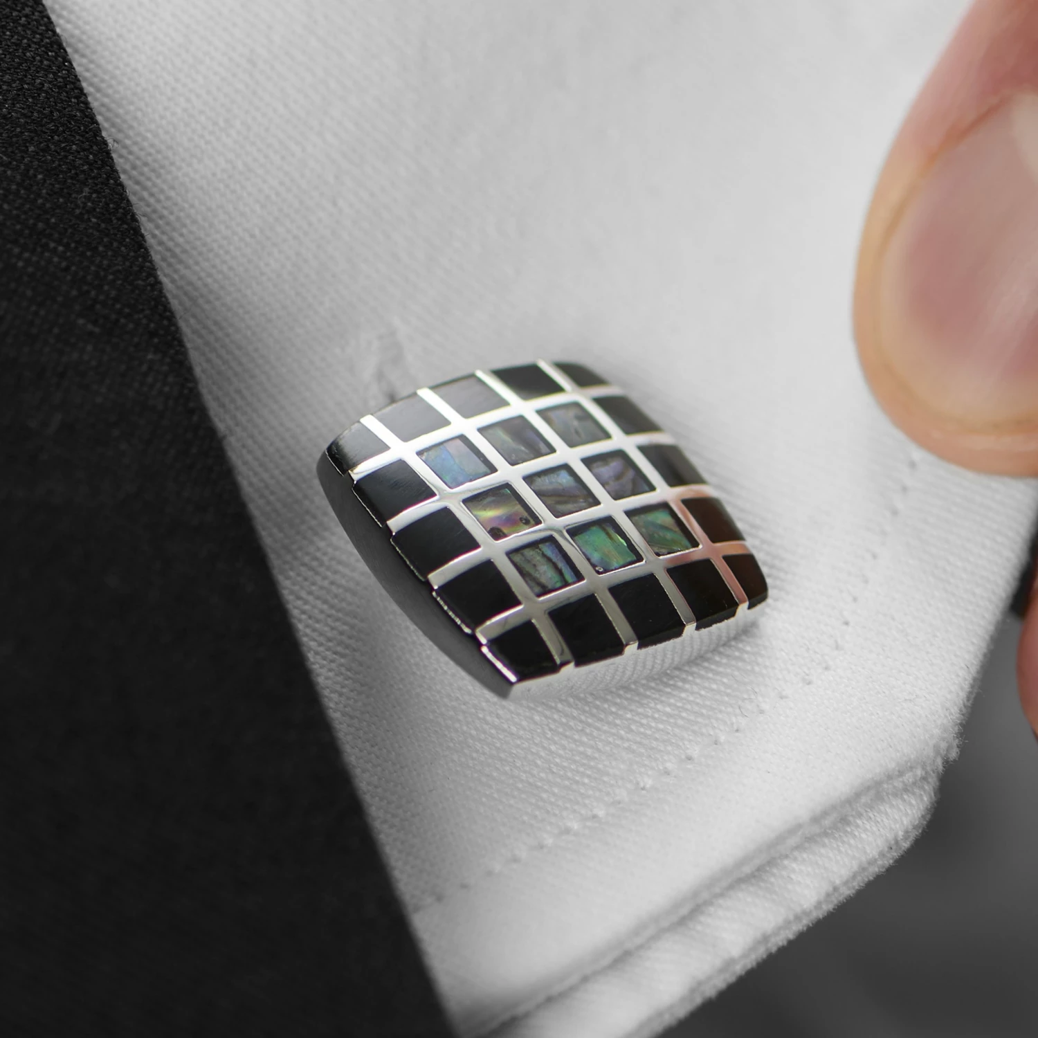 With a curved silver stem, sophisticated body, and a fixed pin, these cufflinks stand out from the crowd. An ideal balance between light and dark; their strong, clear frame of bold black squares perfectly highlights their more ornate center.